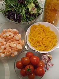 Fresh chilli instead of powder might not make you sneeze so much, although it costs a bit more time to prepare. I like fresh ginger cut in cubes and added together with the garlic, but hubby doesn't like it, so I leave it. Spice-wise this recipe has a lot of degrees of freedom to play with. What I basically want to show you with these recipes is, that it is easily possible to cook something fresh within 10 - 12 minutes. These days almost all of the professional chefs come up with 'fast food' cook books and then it turns out that they bang some sausages in the oven and open a tin. In my recipes I'm trying to use ingredients which are not preprocessed like sausages. The only tins I'm using are tomatoes - they are a real live savers. Well and pasta and cheeses are preprocessed, but it's easy to follow up what's in there. If you don't like the idea of warm stuff on lettuce - then just steam some broccoli while you do the rest, and mix them in with the rest of the frying pan. Just play around - food is fun! |
