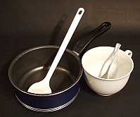 In using a teflon lined pot one can't mix in it well without scratching the surface, so then a decent size cup or a shaker would be the tools to use.