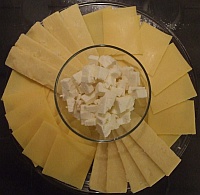 Peel and finely slice the onion. Keep covered that stuff stinks through the whole house. Prepare a cheese platter in cutting the slices to match the size of the pans Slice the salmon into thin squares 1 by 1 inch. It doesn't need to be pre-cooked as it will cook quickly in the raclette oven. Put in a bowl, cover and keep in the fridge |