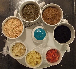 Fill small containers like egg cups for spices, chopped fresh chilli, ginger and garlic