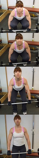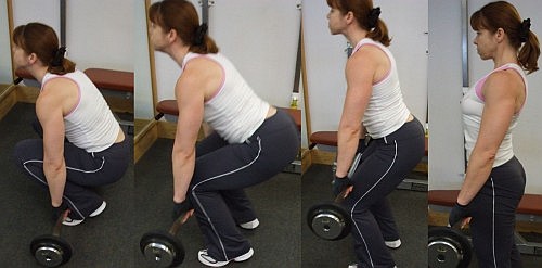 It is very important to keep the weight as closely to the body as possible. Don't lift the weight with arms and shoulders, but only guide it along your legs. The tricky bit is the knees. You can tell from the pictures that this is the moment where the biggest strain is on the lower back.