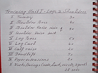 I have split the exercises into two units. Some exercises effect each other quite a bit. Working those on different days makes things more effective and easier. One doesn't have to stick to a particular order too much when equipment is not available. It already is an advanced training plan - it doesn't stick with the 'Three/12' rule anymore. But even then: Write down the exercises you are doing. Seeing it in writing gives a sense of achievement when you are finished.