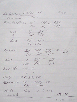 Well knowing that I can do the 15 reps in the first set I tried harder and there they were. So I skipped the second set and did 3 sets of the heaviest weight. And you can see that I'm already approaching the lucky number of '12' reps. That was on the 30th July. That is quite an improvement within 1 week which couldn't have been done without visualising the progress by writing it down.